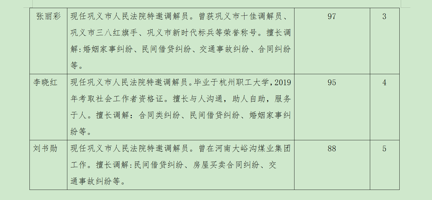 巩义市人民法院驻庭调解员工作绩效考核及排名